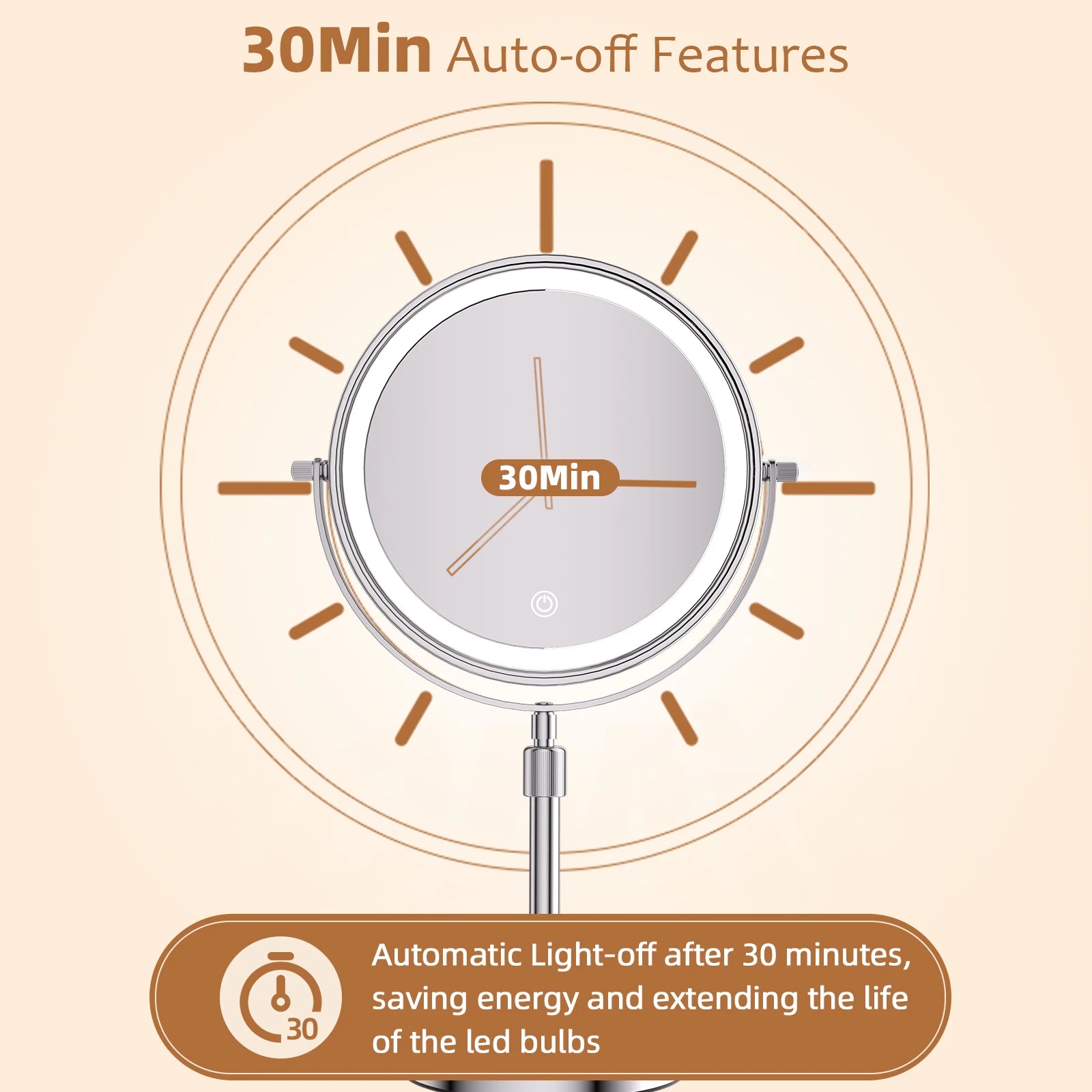 Elegant 8-inch double-sided makeup mirror with adjustable lighting and magnification for flawless beauty routines. Designed for precision, comfort, and portability.