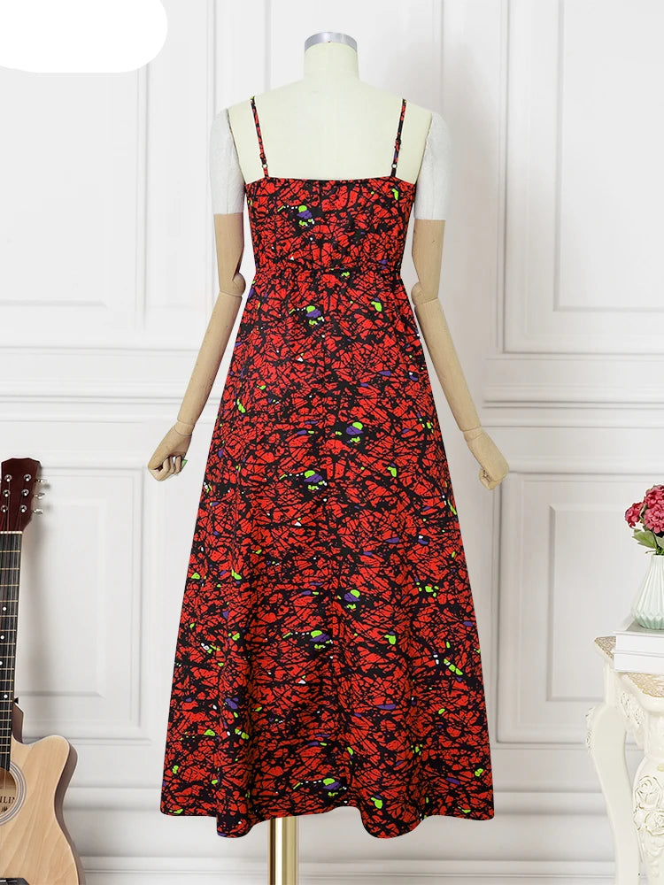 This bohemian-inspired strap dress features lace patchwork and a flowing ankle-length silhouette. Designed with a printed pattern and pleated A-line shape, it’s a perfect choice for summer parties, vacations, and casual gatherings.
