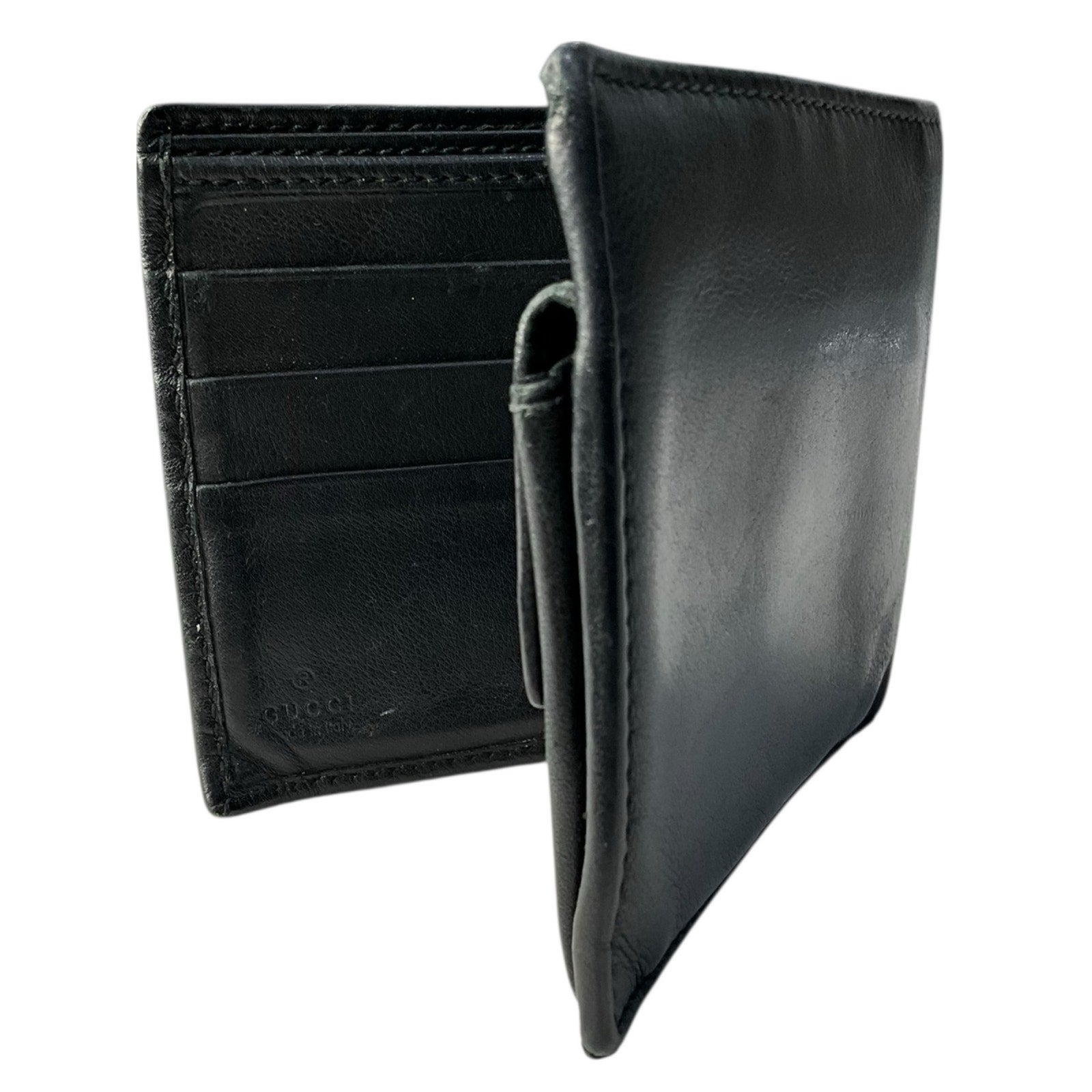 This is a stylish Gucci men's bifold wallet in classic black leather. It's perfect for everyday use and will keep your cards and cash organized.
