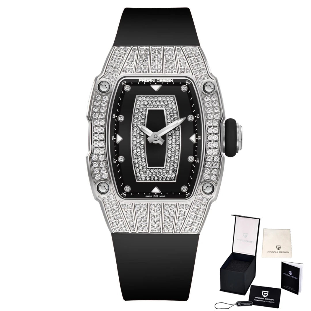 Experience modern elegance with this luxury diamond-encrusted women’s watch from Pagani Design. Featuring a distinctive wine barrel-shaped case and a comfortable rubber strap, it blends high fashion with sporty appeal. The luminous display and waterproof design make it perfect for both day and night wear.