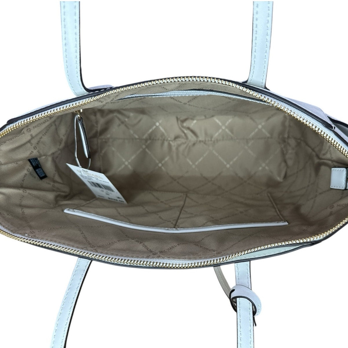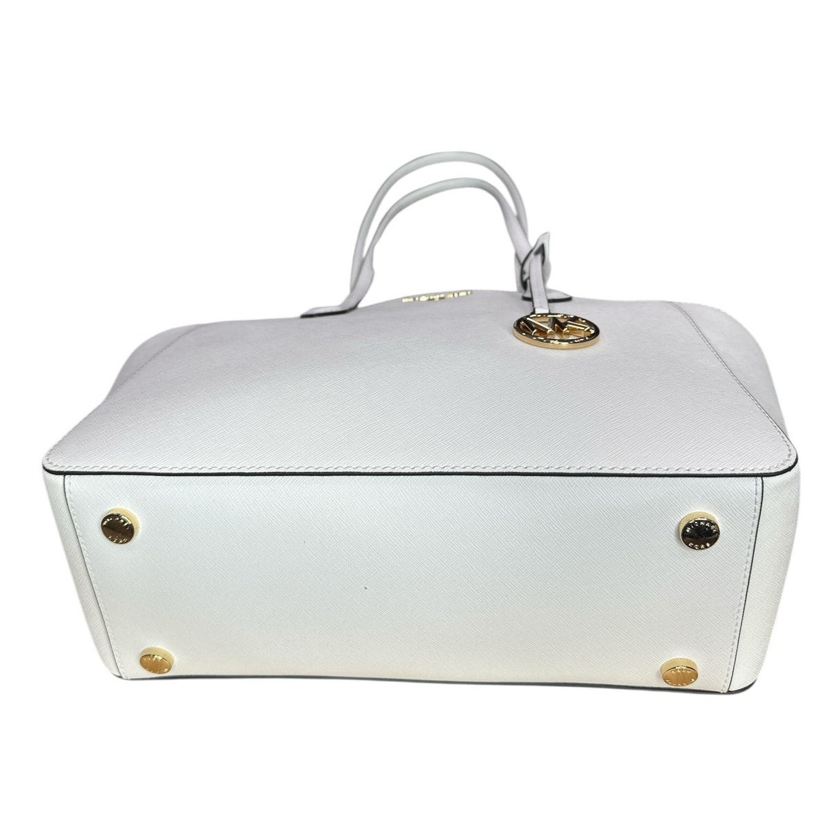 Elevate your everyday style with the Marilyn carryall, the ultimate tote for the modern woman. Crafted from structured Saffiano leather, it showcases the signature gold-tone “MK” hardware and a polished logo charm. The spacious, zip-top interior offers organized storage with a back zip pocket and two slip pockets for essentials. Two side slip pockets add extra utility, while the slender straps sit comfortably over the shoulder. Finished with protective metal feet and gold-tone accents, this refined white tote embodies timeless sophistication.
