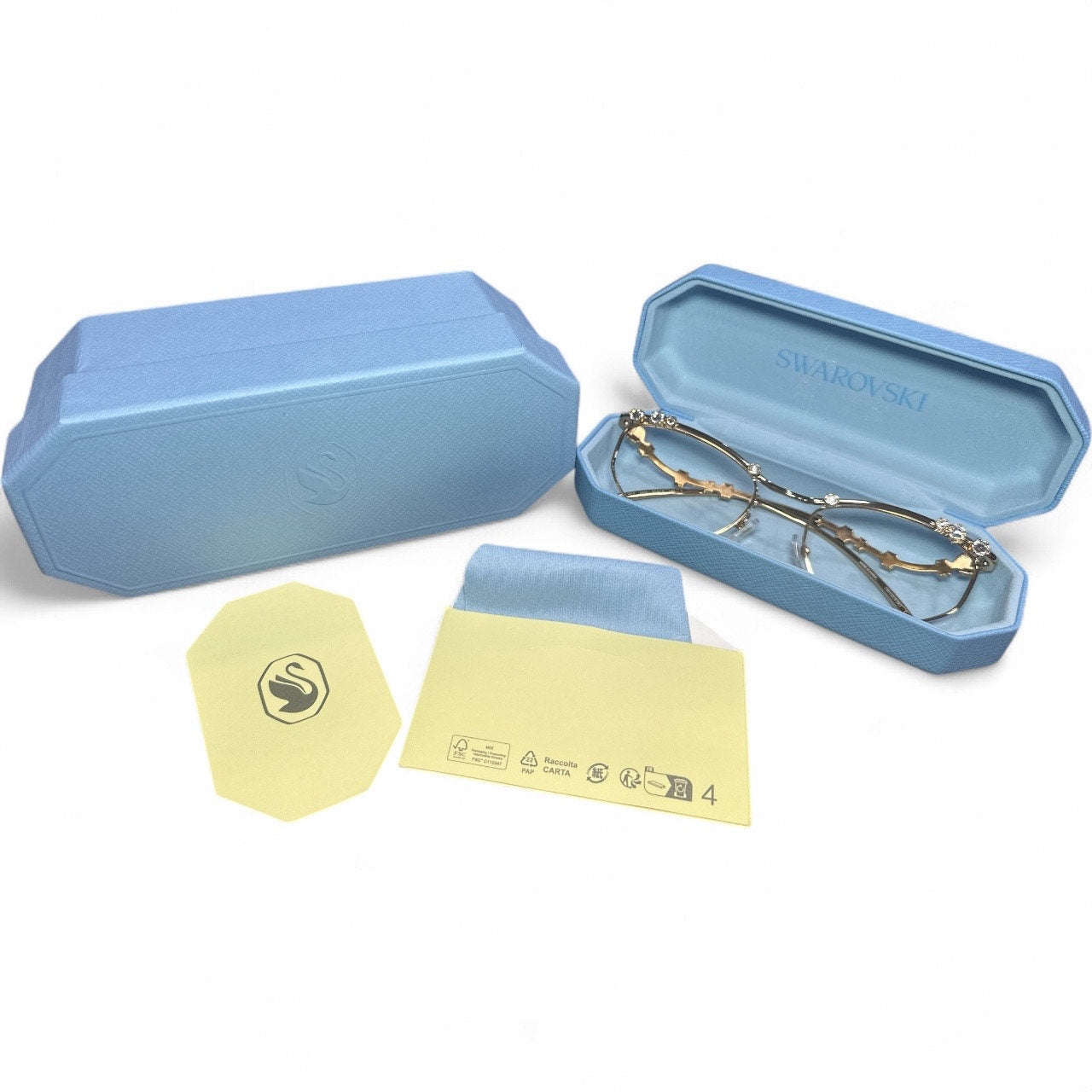 Experience the perfect blend of style and optical excellence with these Swarovski SK1015 glasses. These frames come brand new in a beautiful light blue box and case, ready to elevate your look. The unique geometric shape and luxurious gold frame add a touch of sophistication to any outfit.