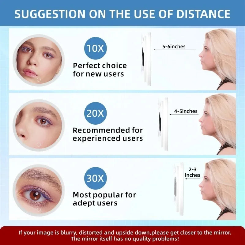 Enhance your makeup and grooming routine with this 6-inch magnifying mirror featuring 5-30X zoom, LED lighting, and a 360° adjustable stand. Portable and versatile, it can be used as a tabletop, handheld, or suction-mounted mirror. Three lighting modes and stepless brightness adjustment ensure perfect visibility for precise makeup application or grooming, anytime and anywhere.