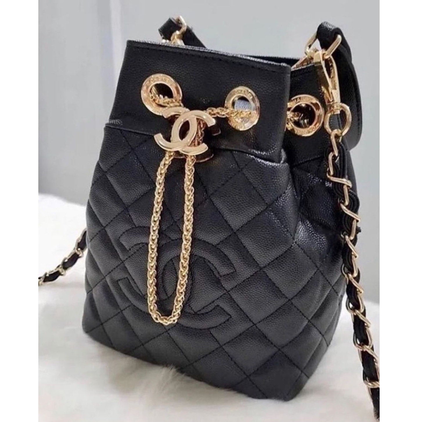 This stunning bag features a luxurious quilted design, a convenient drawstring closure, and an elegant gold chain strap. The prominent gold CC logo charm adds a touch of iconic Chanel glamour.