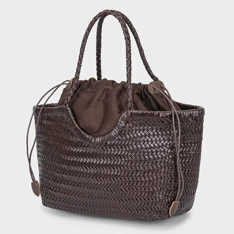 This genuine cowhide tote bag features a handmade woven design with a soft and flexible texture. Its spacious bucket shape makes it ideal for shopping, travel, or daily use, while the double handles provide versatile carry options.