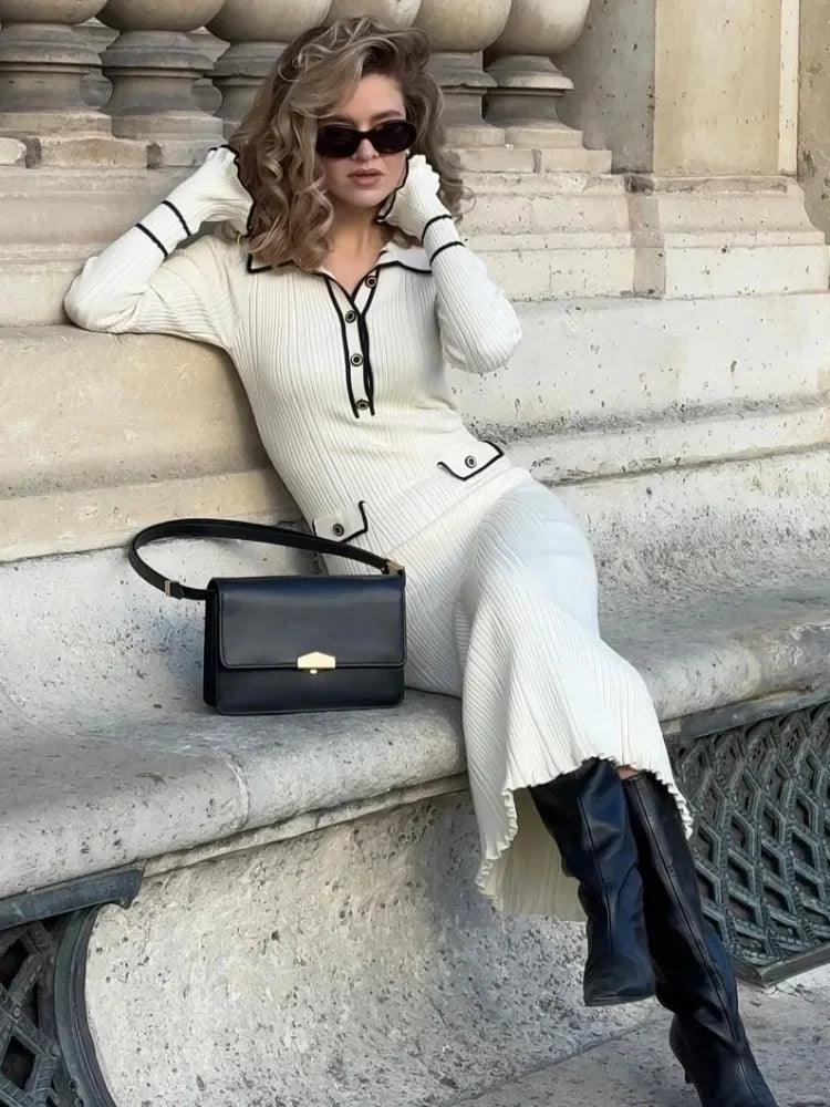 Elevate your seasonal wardrobe with this elegant knitted maxi dress designed for autumn and winter wear. Featuring a ribbed texture, ruffled details, and a high-waist silhouette, this long sleeve dress offers a slim and flattering fit. Perfect for banquets, formal events, or elegant outings, it combines comfort with refined style.